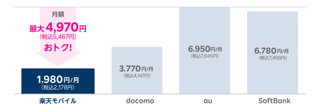 競合の携帯電話会社の基本料金を比較すると、電話かけ放題プランは楽天モバイルがトータルで安くなっています。