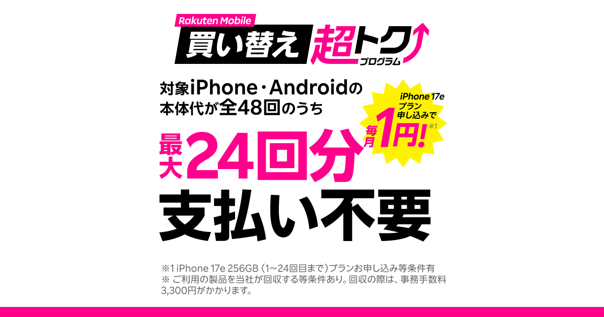 楽天モバイルでは、「Google Pixel 9a」の取り扱いを開始いたしました。「買い替え超トクプログラム」を活用すると、48回払いにして 25カ月目に返却すれば残り24回分の支払いが不要となるので、 端末の実質負担額が下がります。お得なキャンペーンを利用して、お得にGoogle Pixel 9aをゲットしましょう。