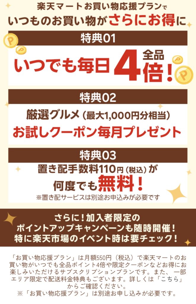 楽天マートの「お買い物応援プラン」は、月額550円のサブスクリプションサービスです。