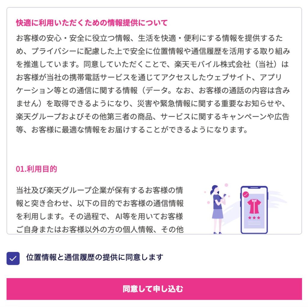 (4) 規約などを確認して、「同意して申し込む」を押します。
