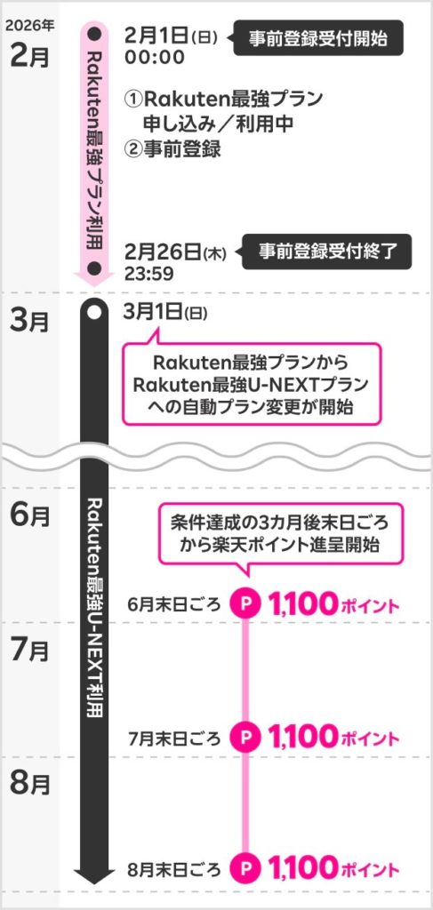 キャンペーン開始は3月1日からですが、事前登録を行うことで、3月1日になるとRakuten最強プランからRakuten最強U-NEXTで自動で変更されます。